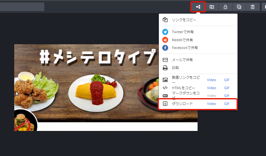 動画形式でもGif画像形式でも保存可能です。シェアボタンをクリックで、『video』『GIF』があるのでお好きな方をクリックでダウンロード。
