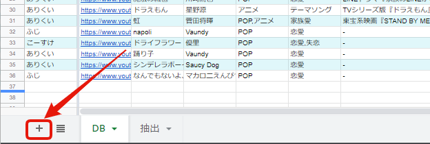 (2)先の表とは別のシートで作業したいので、右下の「+(プラス)」マークでシートを作成します。今回はすでに用意してある『抽出』シートを使用します。