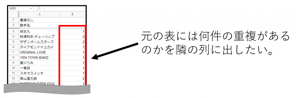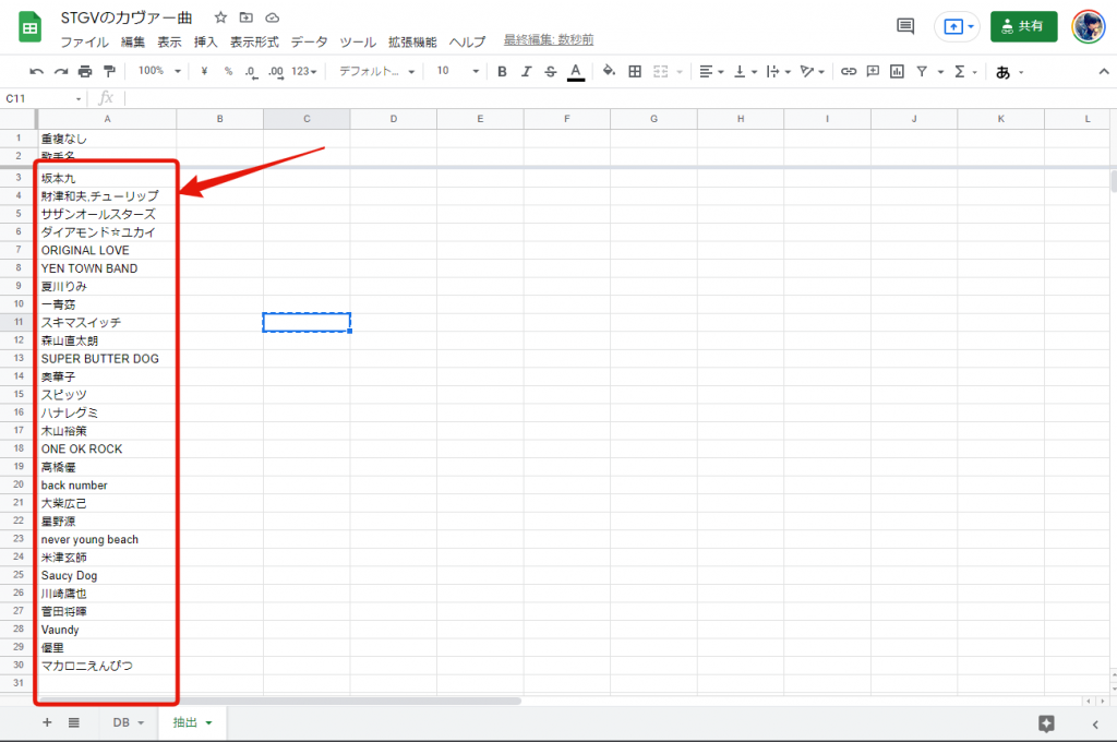 (3)(2)で作成したシートのA3以降に重複削除されユニークになった歌手一覧を表示させます。