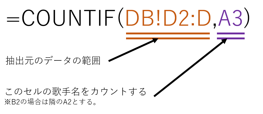 (1)B3に『=COUNTIF(DB!D2:D,A3) 』と入力します。