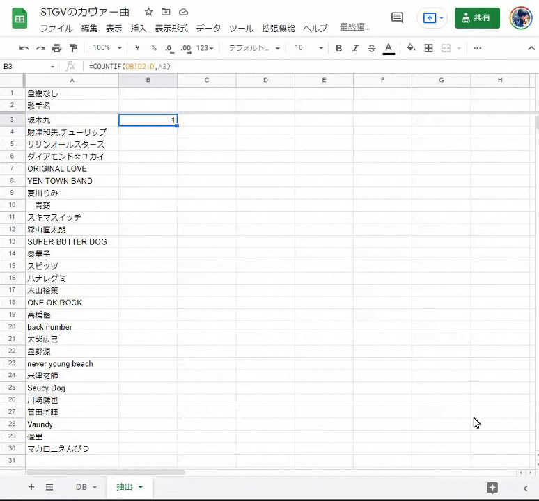 この記事のスクショ元のスプレッドシート『STGVのカヴァー曲まとめ(スプレッドシート関数サンプル)』、『STGVのカヴァー曲まとめ(スプレッドシート関数サンプル)_再生数定点』で公開してます。