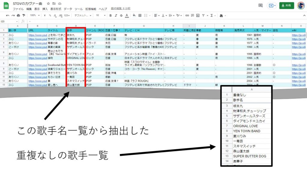 (1)まずはデータを用意します。今回は下記のように私の好きなミュージシャンの方のカヴァー曲動画一覧を使用します。この表の『D列:歌手』には様々な歌手名が記入されていますが、これらをユニークデータにします。