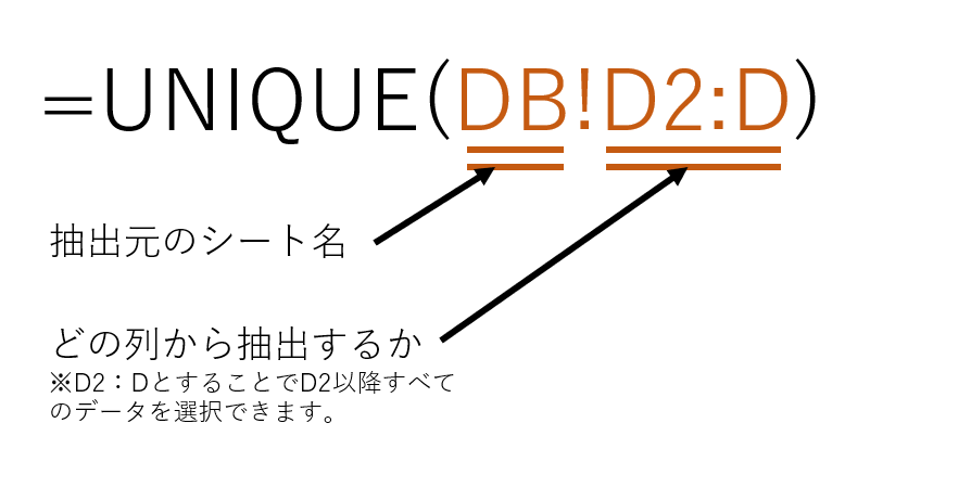 (4)3Aに『 =UNIQUE(DB!D2:D) 』と入力します。