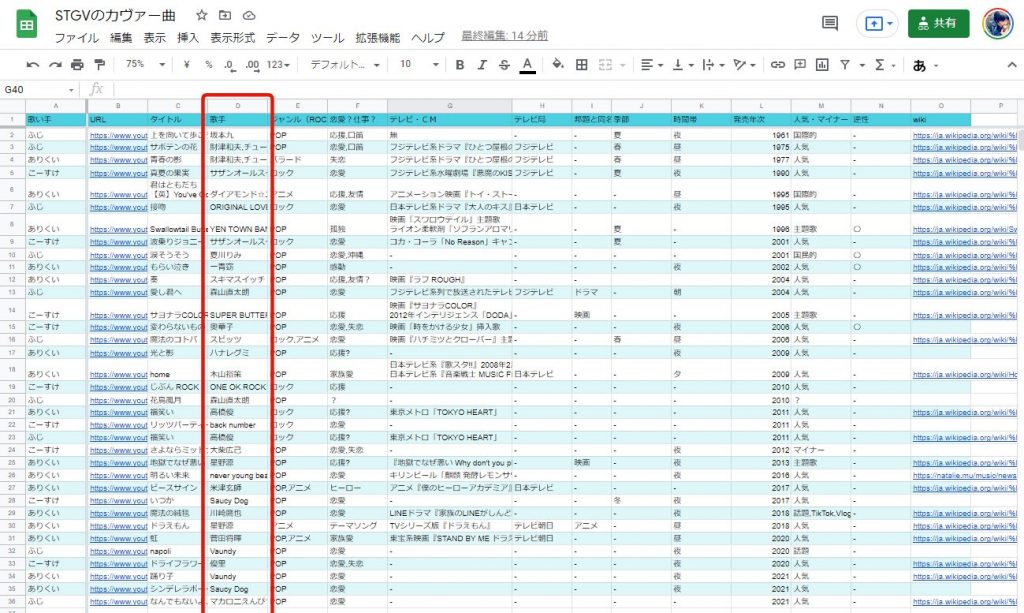 このスプレッドシートで収集・集計しているのは、私の応援している大分県の仲良しミュージシャンSTGVのメンバーの方がYouTubeチャンネルにアップしているカヴァー曲の情報です。