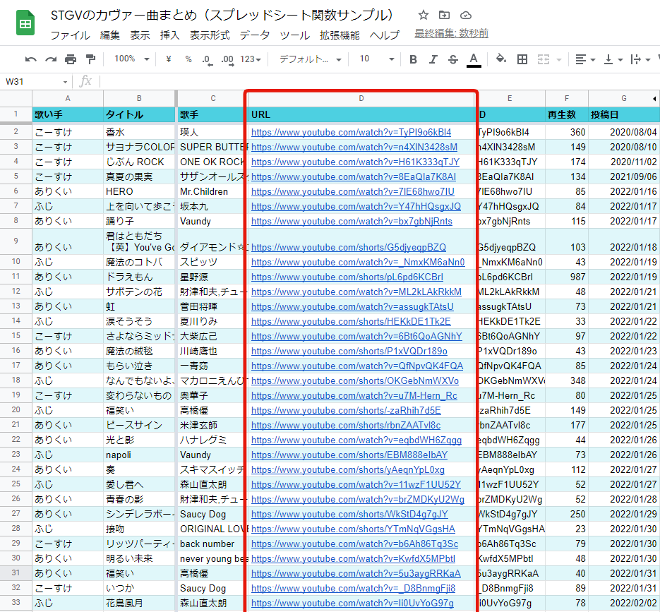 この記事のスクショ元のスプレッドシート『STGVのカヴァー曲まとめ(スプレッドシート関数サンプル)』、『STGVのカヴァー曲まとめ(スプレッドシート関数サンプル)_再生数定点』で公開してます。