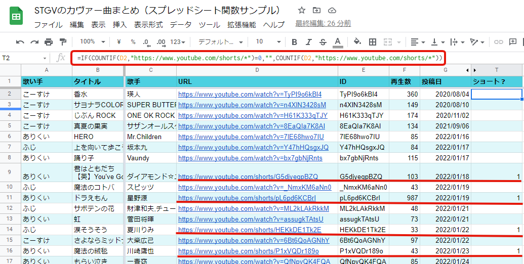 スプレッドシートでYouTubeの情報を集計していろいろ模索しているのですが、『ショート動画』と通常の動画のどっちが再生されるんだろう?と思って『ショート動画かどうか』を判定する列を追加してみました。
