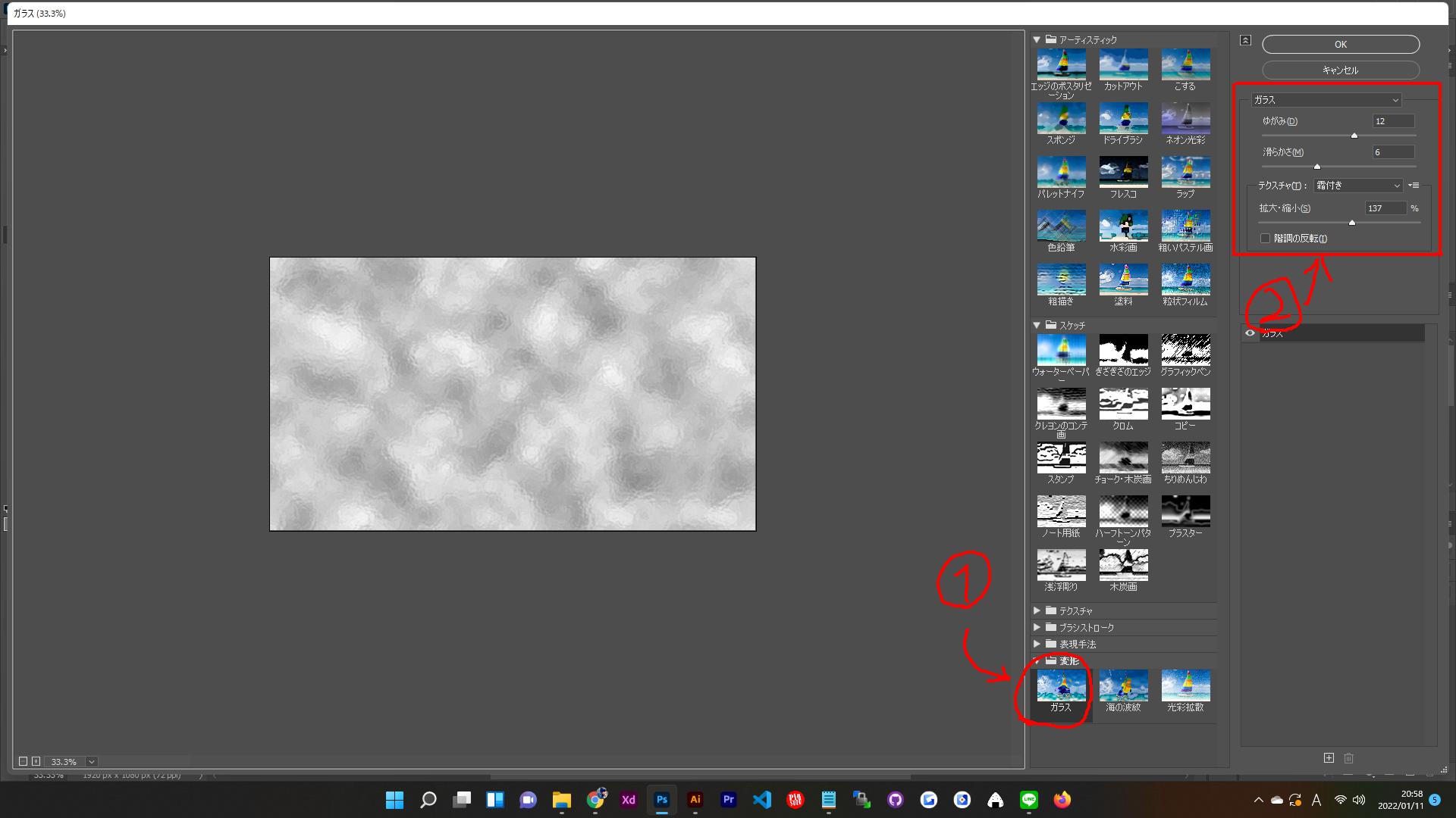 (4)様々なフィルターが表示されます。①のガラスフィルターを選択します。②の調節パネルでレベルを調節します。OKで適用します。