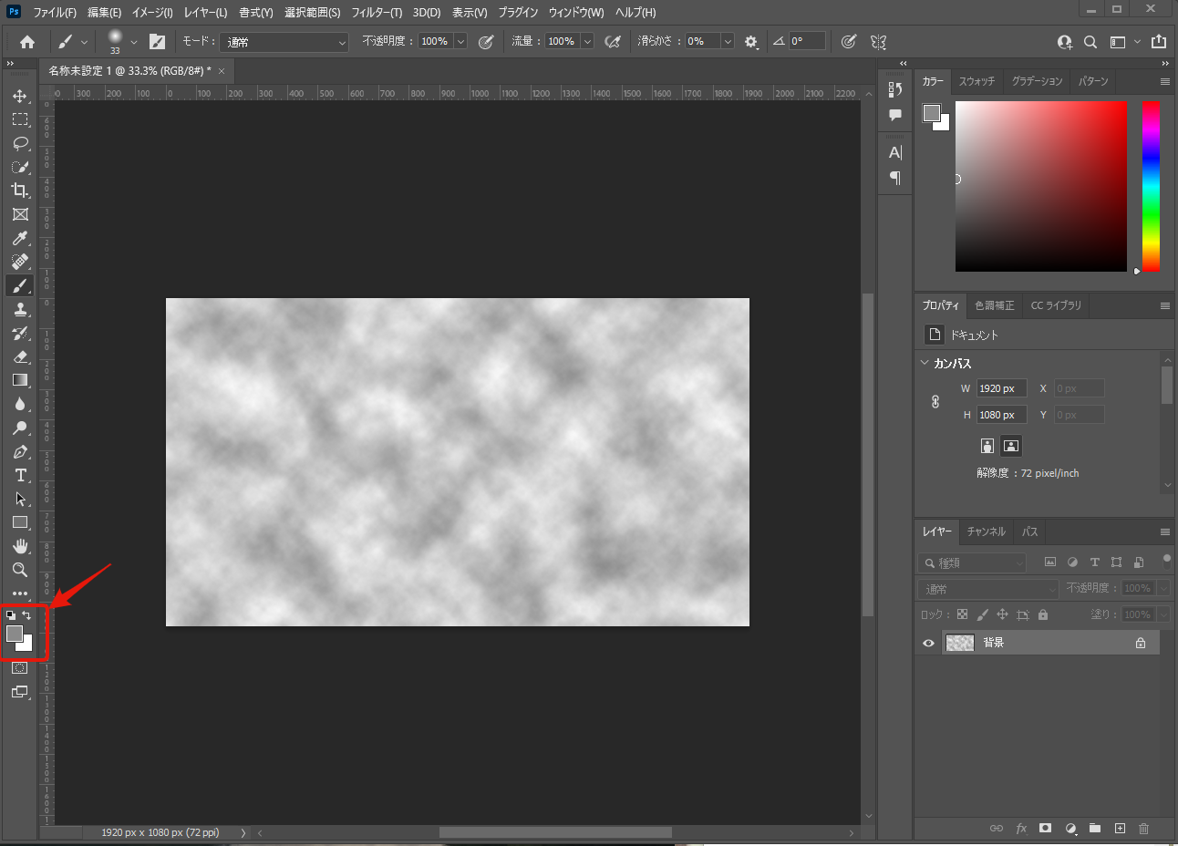 (2)下記のスクリーンショットの左メニューの箇所の色の選択パネルで選択している2種の色で雲模様が生成されます。ここで青色を選ばす、白とグレーの組み合わせにします。