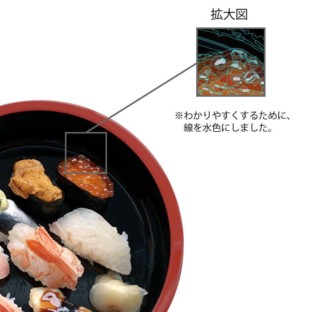 先にも書いたように四角い粒の集合体のため、一見美味しそうなお寿司の写真に見えますが、拡大するとカクカクの画像になってしまいます。