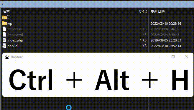 ファイル・フォルダ一覧が表示されているところをクリックして、『Ctrl + Alt + H』のショートカットキーを入力することで、隠しファイルの表示と非表示を切り替えることが可能です。