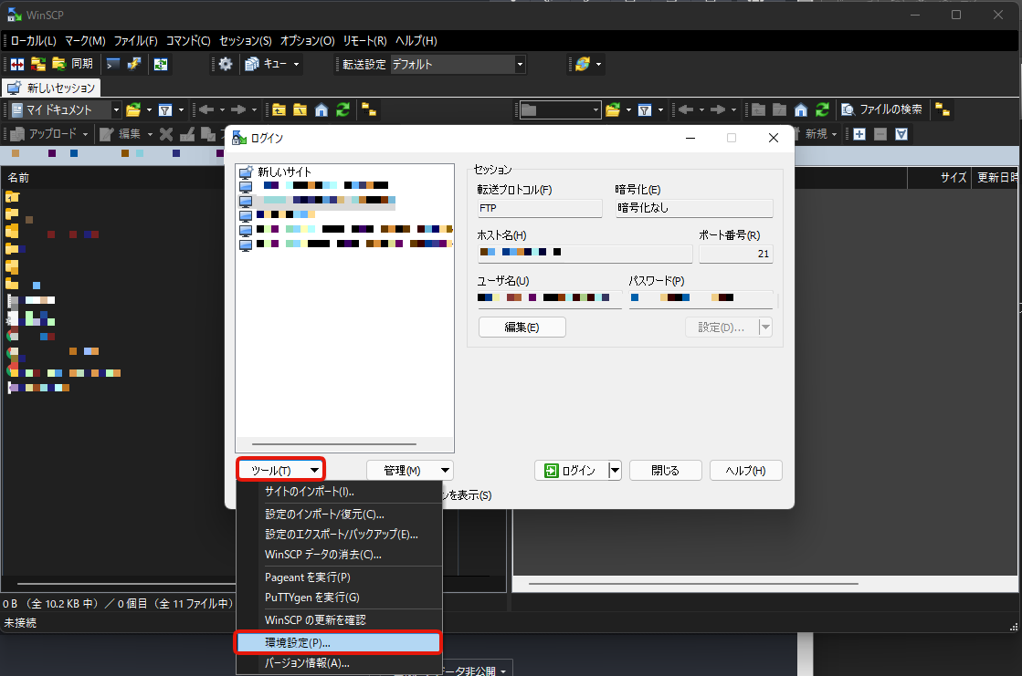 (1)WinSCPを起動して、左下の ツール > 環境設定 を開きます。